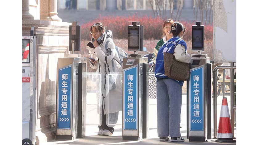 中國教育部、國家衛生健康委、國家疾病預防控制局近日聯合發佈《關於印發高等學校、中小學校和托幼機構新型冠狀病毒感染防控技術方案(第七版)的通知》,明確高校、中小學不強制要求師生佩戴口罩;幼托機構幼兒在園期間不佩戴口罩,教職員工在園期間不強制要求佩戴口罩。資料圖為首都經濟貿易大學學生“刷臉”進出校門。 中新社