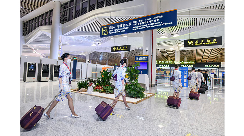 15日,海南航空HU747航班從海口美蘭國際機場順利起飛前往新加坡,標誌著海口至新加坡客運航線正式恢復,這也是該機場恢復的第四條國際及地區定期客運航線。圖為海南航空HU747航班機組人員進入海口美蘭國際機場T2國際出發區。 中新社