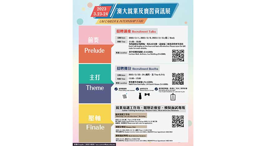 【特訊】澳門大學將於3月23及24日舉辦“2023 澳門大學就業及實習資訊展”,將有超過110間來自不同行業的企業和機構在澳大擺設招聘攤位,提供超過3000個職位空缺。
