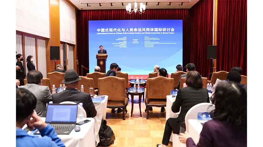 3月27日,“中國式現代化與人類命運共同體”國際研討會以線上線下相結合的方式在北京舉行。來自中國、英國、法國等14個國家的近百位與會代表圍繞相關主題進行了交流探討。圖為研討會現場。 (中新社)