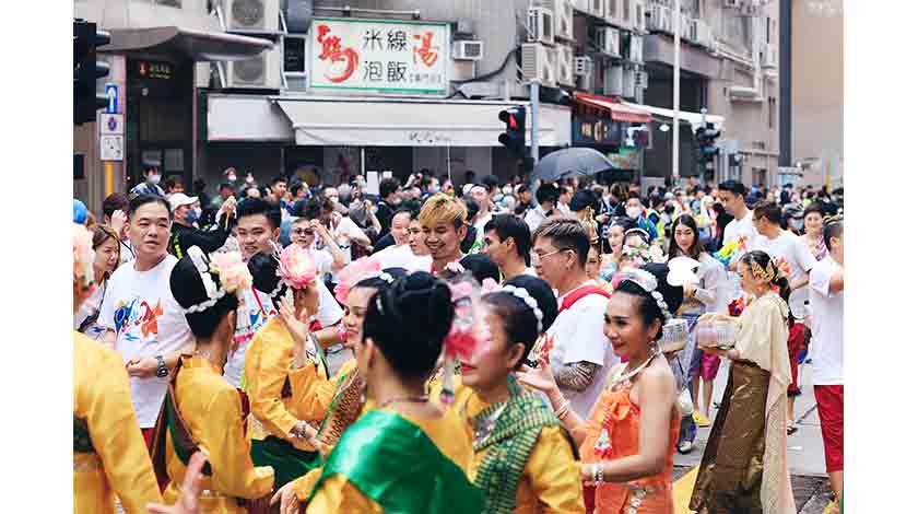 這一天,平日隱於人群的泰國人,穿上傳統服飾或花色短袖,從香港四方趕來。沿路的商店外每隔幾米便有一個小佛壇,過路的人彎下身,掬一杯花瓣浸泡過的清水,虔誠地澆向佛像;不問年紀,無論相識與否,大家打成一片,從路邊的水缸中將水槍抽滿水,上演一番街頭“水戰”……