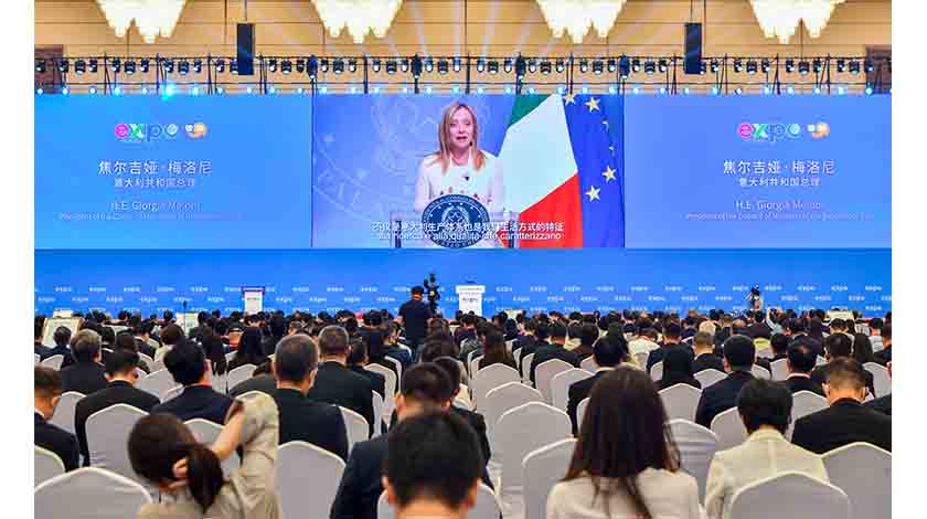 4月10日,第三屆中國國際消費品博覽會在海南海口開幕,意大利共和國總理焦爾吉婭•梅洛尼在開幕式上視頻致辭。 中新社