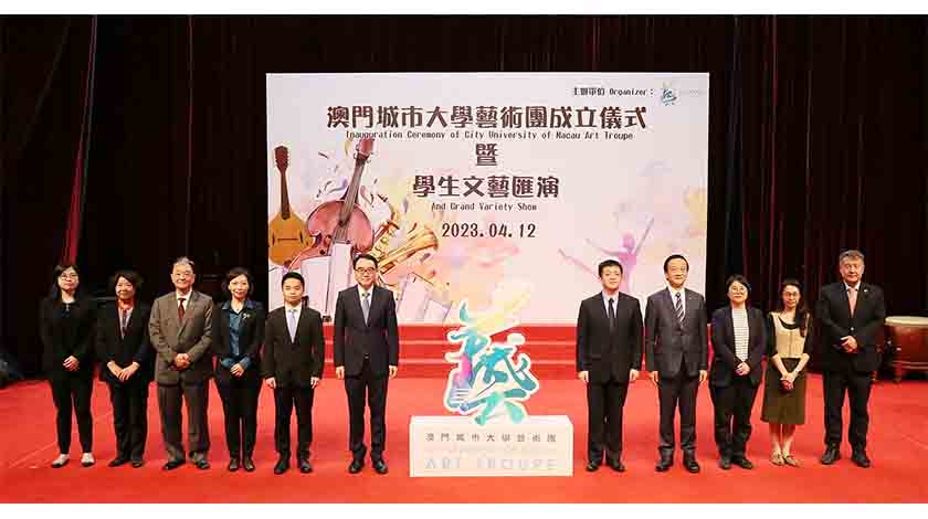 【特訊】為營造濃厚的文化及藝術氛圍,提高學生藝術修養,豐富校園生活,為學生搭建施展才華的舞台,澳門城市大學藝術團昨(12)日於氹仔校區文化中心舉行成立儀式,同場舉行學生文藝匯演,通過管弦樂、民樂、合唱、舞蹈等多元化的藝術表演展示多彩城大。中央人民政府駐澳門特別行政區聯絡辦公室教育與青年工作部部長李雪飛、中華人民共和國外交部駐澳門特別行政區特派員公署新聞和公共外交部主任高原參贊、教育及青年發展局副局長丁少雄、城大基金會信託委員會主席劉藝良、城大校董會副主席吳在權、澳門立法會議員宋碧琪、澳門科學館股份有限公司董事長穆欣欣,城大校長劉駿、副校長兼藝術團團長孔繁清等出席活動。