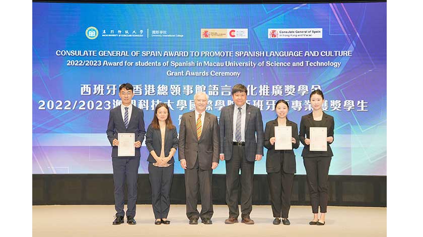 隨後,阿基迪卡總領事於澳科大D座禮堂代表西班牙駐香港總領事館向澳科大國際學院西班牙語專業的三位四年級學生頒發西班牙語言文化推廣獎學金(獎學金金額為每名學生五千元港幣)。該獎學金旨在鼓勵和支持學生深入瞭解西班牙的語言文化,並為加強中西文化交流做出貢獻。獲此殊榮的學生分別是鄭書媛同學、張羽馳同學和申奧同學。