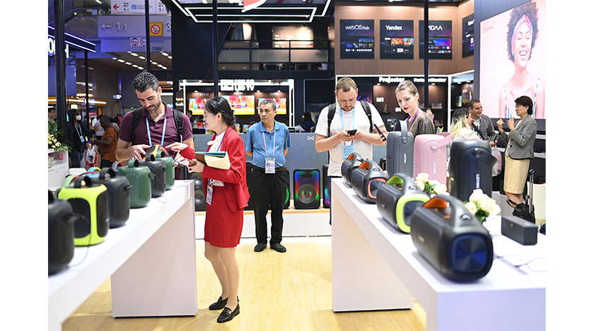 4月19日,第133屆廣交會一期在廣州廣交會展館閉幕。記者連日來採訪發現,中國企業展出大批技術含量高、品質優良、設計新穎的產品,既“吸睛”又“吸金”,展現了“中國製造”的新優勢,收穫大量訂單。根據中國對外貿易中心統計數據,截至4月18日,第133屆廣交會展館進館累計客流量超過百萬人次。圖為廣交會展館一展位的音響設備吸引採購商。 中新社