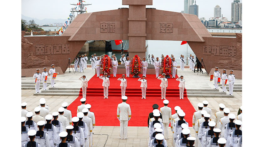 4月23日上午,為慶祝中國人民解放軍海軍成立74周年,中國海軍在青島海軍博物館隆重舉行致敬人民海軍英雄儀式。 中新社