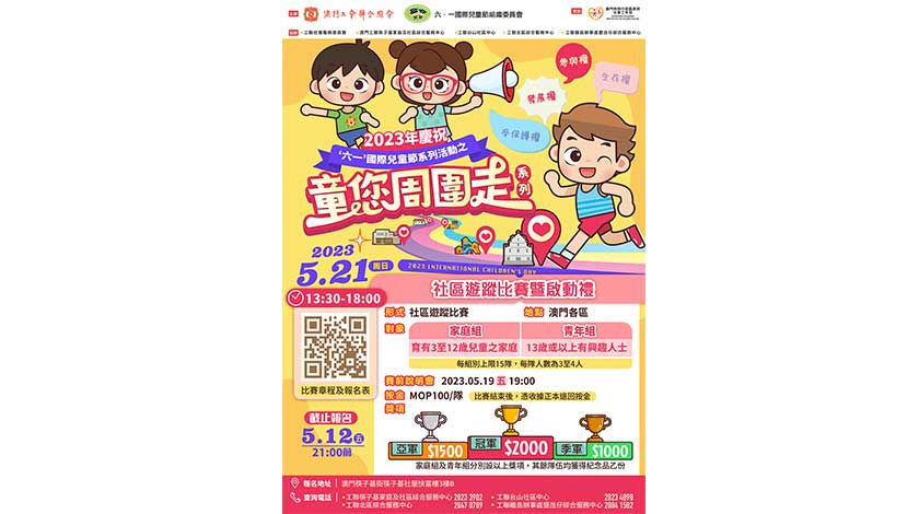 「童您周圍走」社區遊蹤比賽由即日起至5月12日接受報名。透過社區遊蹤比賽,加深市民對於兒童權利的關注,認識並加強推廣保護兒童的意識;同時希望推動本澳家庭及青年在疫後多走進社區,共同建立正向積極的關係與健康身心的狀態。是次比賽將於5月21日(星期日)下午1時30分至6時舉辦,名額共30隊,分家庭組及青年組各15隊,每隊由3-4人組成。路線將為澳門大三巴一帶世遺及社區地點進行,參加者需於指定時間內以徒步或乘搭公共交通工具形式,到達各任務點進行打咭及團體任務,最終以時間最快及分數最高作評分準則,競逐冠、亞、季軍獎項。冠軍澳門元2000元正、亞軍澳門元1500元正、季軍澳門元1000元正。希望市民大眾多多支持,踴躍參與。
