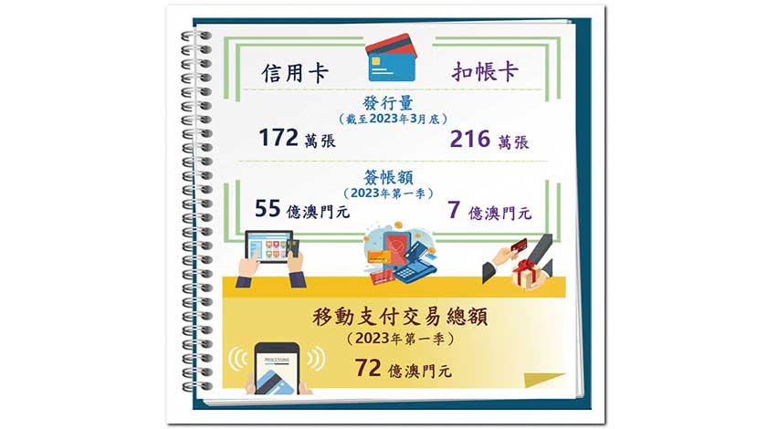 由澳門銀行核發的個人信用卡總數於2023年3月底為1724841張,與2022年底比較上升1.3%。澳門銀行核發的扣帳卡總數達2156407張,按季增加2.2%。