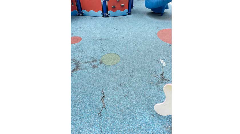 【特訊】2016年市政署對祐漢新邨第四街休憩區進行重整,並於2017年重啟,現時休憩區面積有1600平方米,並設有多個功能區,包括下棋區、聊天區、兒童遊戲區、兩個健體園地及兩個體操園地等,日常吸引不少兒童在此耍樂。日前,馬黑祐坊會在巡區時發現,兒童遊戲區區域的橡膠地墊出現明顯裂痕,在雨天過後出現滲水、積水的情況,影響保護功能,並容易因積水出現誘發蚊蟲滋生。