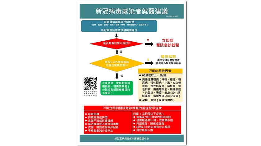衛生局強調,不具重症風險因素或沒有重症警示症狀的青壯年及兒童,感染新冠病毒後使用對症治療藥物即可;若需要就醫應儘量使用非急診服務,避免佔用緊急的醫療服務資源;此外,亦建議有關機構或學校不用員工及學生提供醫生證明,根據其抗原檢測呈陽性的結果,酌情處理給予休息,儘量減少不必要的醫療擠兌,而感染者在症狀緩解後即可復工或復學。若有關機構或學校認為感染者仍需上班或上學,則應嚴格遵守預防呼吸道傳染病指引佩戴口罩。