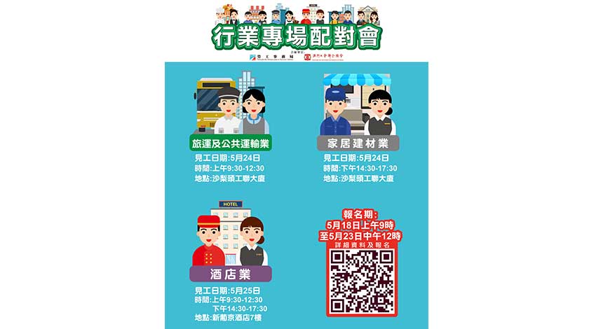5月24日上午舉辦旅運及公共運輸業配對會,提供95個職位空缺,涉及車長、站長、車務員、站務員、客服員及清潔員。下午舉辦家居建材業配對會,提供206個職位空缺,涉及招商專員、營銷策劃專員、店務員、各類裝修工人及配送安裝工人等。上述配對會在澳門工會聯合總會(沙梨頭海邊街2-6號工聯大廈)舉行。