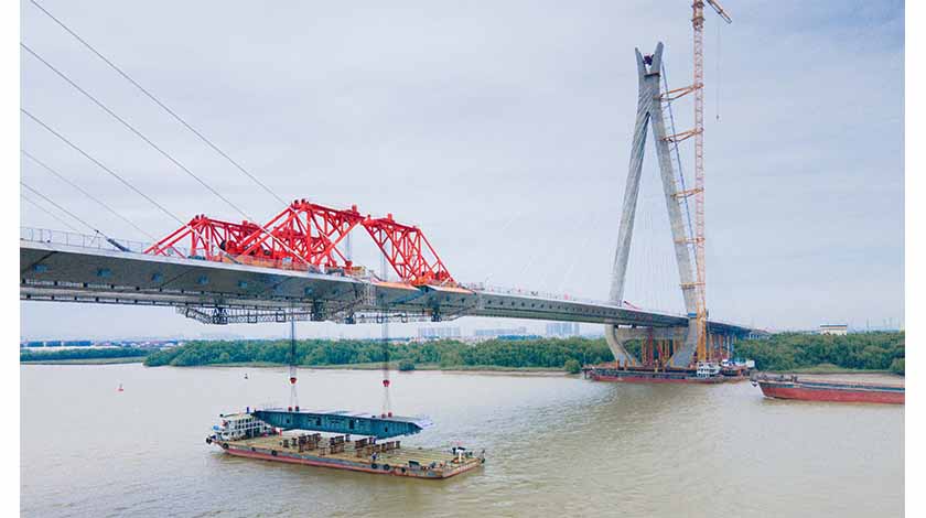 5月21日,粵港澳大灣區工程南中高速洪奇門特大橋在廣州南沙合龍。一橋飛架珠江,廣州、中山兩市在此實現跨江“牽手”,大灣區互聯互通按下“加速鍵”。圖為5月16日拍攝的合龍段提梁。中新社