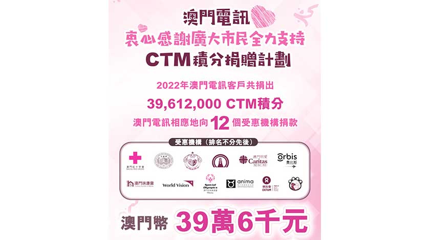 此外,澳門電訊亦透過「積分捐贈計劃」,鼓勵客戶共同參與慈善活動,2022年度,澳門電訊合共捐出澳門幣39萬6000圓,以支持機構開展相關的社會公益工作,十二個受惠機構包括澳門扶康會、澳門明愛、澳門特殊奧運會、澳門仁慈堂、澳門日報讀者公益基金會、澳門同善堂、澳門奧比斯、澳門樂施會、世界宣明會、澳門紅十字會、澳門愛護動物協會和人人流浪狗澳門義工團。