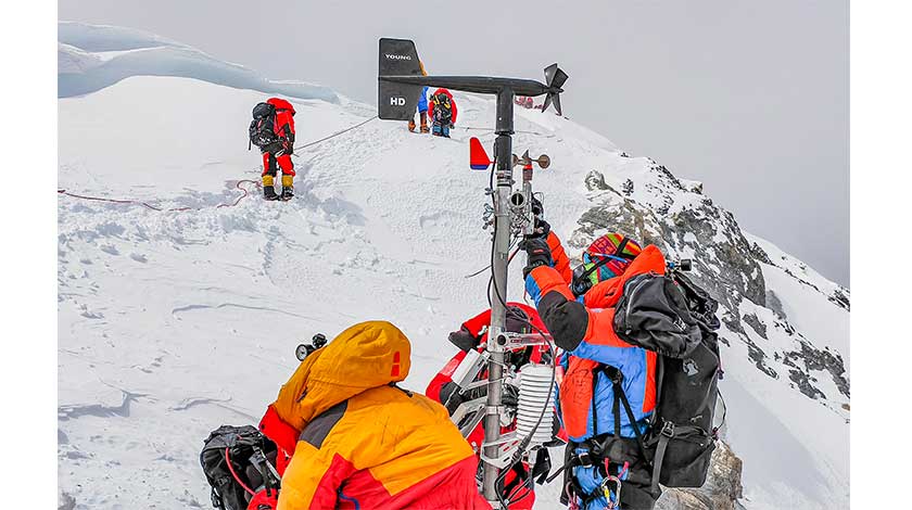 5月23日,科考登頂隊員在珠峰海拔約8830米處維護升級自動氣象站。新華社