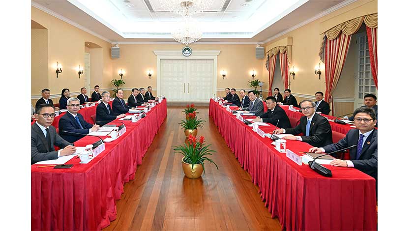 【特訊】十三屆全國政協副主席、國務院港澳事務辦公室主任夏寶龍昨日上午在政府總部與特區政府主要官員舉行座談交流會,轉達國家主席習近平的關懷和期許,並聽取特區政府工作匯報及澳門整體發展現況的介紹,與官員進行了深入的互動交流。