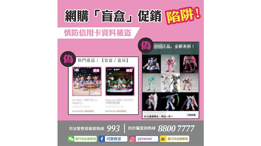 【特訊】近日,司警局接獲多宗舉報,指有人在網上社交平台假冒本澳某店舖名義,訛稱低價出售玩具“盲盒”,要求買家點擊帖文內之連結選購商品,並以信用卡付款。當事主輸入信用卡交易密碼確認付款後,發現交易之金額遠高於其“購物”金額,懷疑對方以低價出售玩具“盲盒”為名套取信用卡資料,再進行未經授權之大額交易,且事主最終未能收到任何商品。