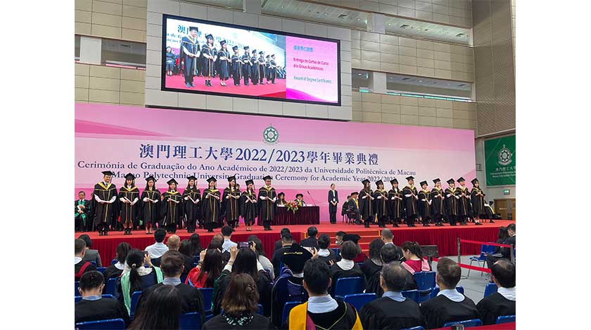 畢業典禮昨假理工體育館舉行,出席嘉賓包括:澳門特別行政區行政長官兼校監代表、社會文化司司長歐陽瑜、中聯辦教育與青年工作部副部長石書正、外交公署新聞和公共外交部主任高原、中國人民解放軍駐澳門部隊戴勁松副司令員、校董會主席崔世昌。