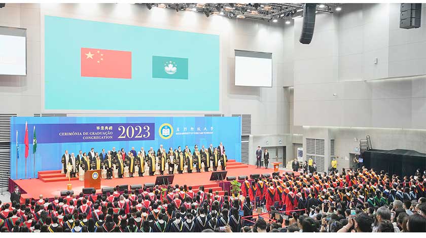【特訊】澳門科技大學2023年度畢業典禮於6月3日下午在大學R座綜合教學大樓綜藝廳圓滿舉行。典禮由澳門特別行政區行政長官代表、社會文化司司長歐陽瑜主禮。出席典禮現場的主要嘉賓有中聯辦教育與青年工作部部長李雪飛、中國外交部駐澳特派員公署新聞和公共外交部主任高原參贊、澳門特區教育及青年發展局局長龔志明、澳科大校監廖澤雲、澳科大基金會信託委員會主席崔世昌、諮詢委員會主席唐志堅、澳科大基金會成員、大學校董和諮詢委員、政府官員、各大企業、獎學金贊助機構、社團協會、學會、本地高校及中學代表、家長親友、教職員等。本屆各學院及研究所的畢業生總數約為4600人,典禮亦通過網絡直播形式,同步在線一起見證開啟人生新征程的重要時刻。大學於同日上午八時舉行畢業典禮的升旗儀式。此外,澳科大各個學院將分別舉行學院畢業典禮。