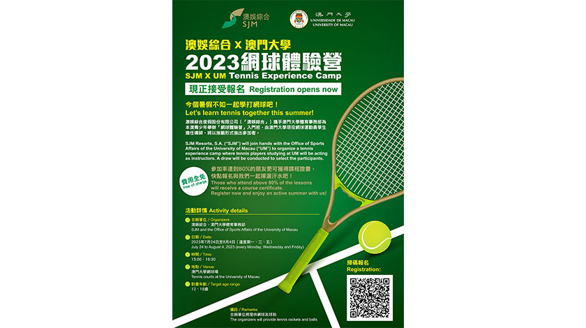 「網球體驗營」將於7月24日在澳門大學網球場舉行,為期兩周,由現役網球運動員的澳大學生擔任導師,教授各種基礎網球動作,例如揮拍、擊球等技巧。是次課程費用全免,並向參與者提供網球及球拍。體驗營現已接受報名,截止日期為6月23日,並以抽籤形式錄取參加者,歡迎12至18歲的青少年參加,透過活動海報二維碼報名,盡情揮灑汗水,享受網球樂趣。