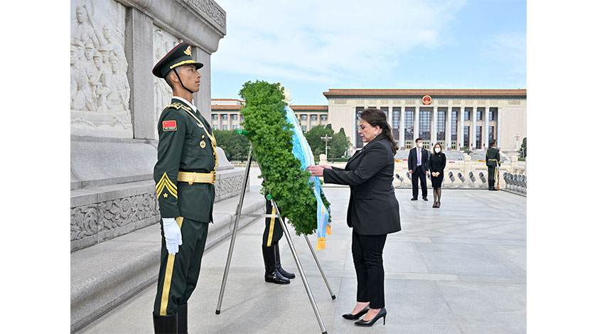 6月12日上午,洪都拉斯總統卡斯特羅前往天安門廣場,向人民英雄紀念碑敬獻花圈。新華社