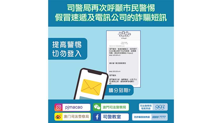 【特訊】近日,司法警察局再度接獲多名市民舉報,指收到懷疑假冒速遞公司或本澳電訊公司的詐騙短訊,以“送貨問題”、“支付運費”或“積分即將無效”為由,誘騙市民點擊短訊內的連結及輸入信用卡資料,最終導致市民的信用卡被不法盜用及造成金錢損失。