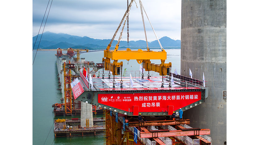 8月11日,廣東省交通集團有限公司發佈消息稱,黃茅海大橋西塔首片鋼箱梁當天在廣東江門臺山完成吊裝,標誌黃茅海大橋上部構造施工駛入快車道。圖為施工現場。中新社