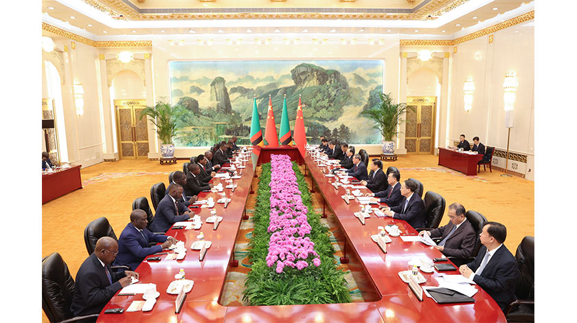 9月15日,中國國務院總理李強在北京人民大會堂會見來華進行國事訪問的讚比亞總統希奇萊馬。 中新社