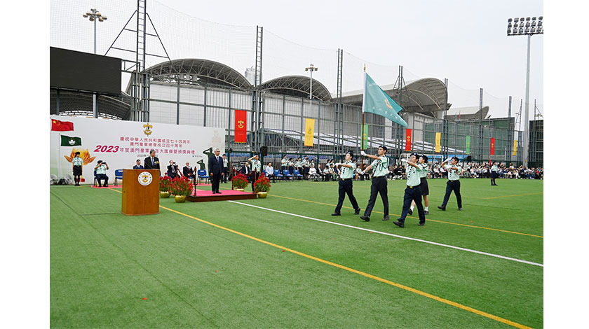 【特訊】澳門童軍總會10月15日在關閘工人體育場舉行《慶祝中華人民共和國成立七十四周年及「二零二三年度澳門童軍周年大匯操暨頒獎典禮」》,行政長官賀一誠代表、保安司司長黃少澤;中聯辦教育與青年工作部副部長石書正;外交部駐澳門特派員公署辦公室主任付愛民參贊、澳門童軍總會會長馬有恆、理事會主席梁少陪、澳門總監周成俊、監事會主席梁顯方等嘉賓出席主禮並作勉勵。會長馬有恆鼓勵全體童軍再接再厲,要更加積極投入童軍運動,更好地服務社會。