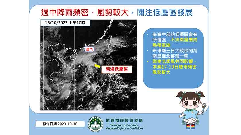 氣象局指,按現時預測資料顯示,該南海低壓區將有所增強,不排除發展成為熱帶氣旋,但預料強度發展一般,未來兩三日大致趨向海南島至北部灣一帶。