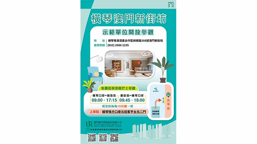 澳門新街坊位於橫琴粵澳深度合作區祥順路388、389號(港澳大道、天羽道及祥順路旁),單位開放時間為週一至周日上午9時至下午6時(內地法定節假日除外)。項目設免費穿梭巴士接載市民往返橫琴「澳門新街坊」及橫琴口岸,每日首班穿梭巴士發車時間為上午9時,尾班車發車時間為下午5時15分,從橫琴口岸珠方口岸北迎客平臺北2門候車停泊區出發,約15分鐘一班次,歡迎市民乘搭前往參觀。