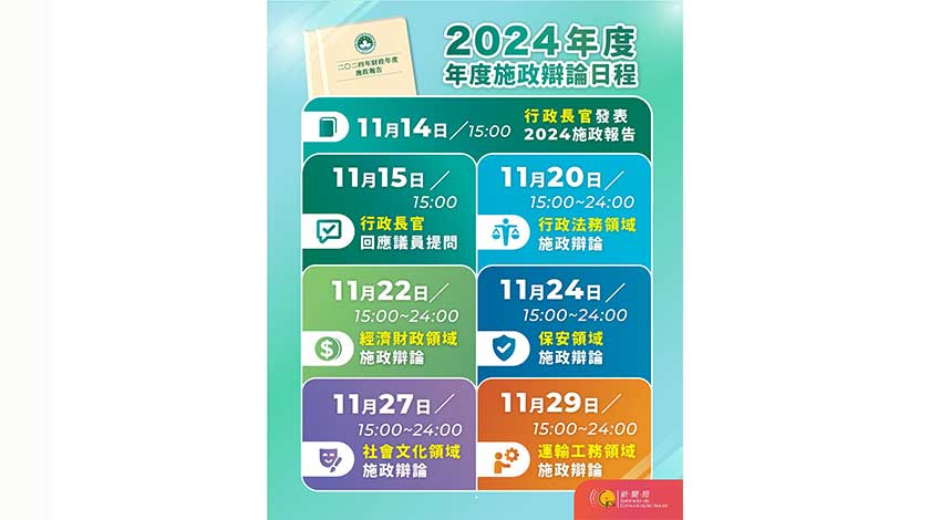 至於2024年度各領域施政方針政策的辯論也將展開,日程分別是:11月 20日辯論行政法務領域、22日辯論經濟財政領域、24日辯論保安領域、27日辯論社會文化領域,以及29日辯論運輸工務領域施政方針。