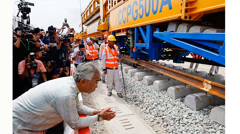 由中國交通建設集團有限公司承建的馬來西亞東海岸鐵路(馬東鐵)項目軌道工程啟動儀式12月11日在馬來西亞彭亨州首府關丹市舉行。馬來西亞最高元首阿卜杜拉在儀式上正式啟動馬東鐵項目軌道鋪設。(新華社)