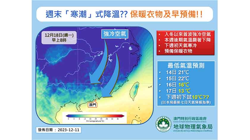 氣象局表示,踏入十二月份,本澳日間氣溫大部份時間仍維持二十度或以上,然而,周末開始,氣溫將迎來明顯的下降。