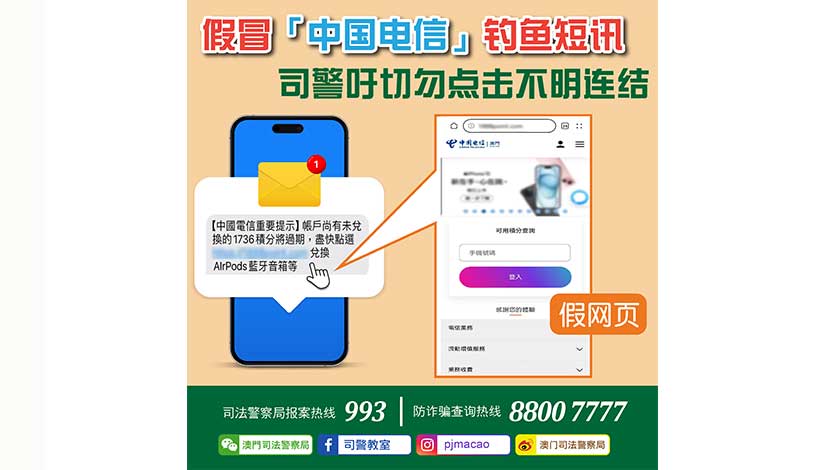 【本報訊】近日,司警局先後接獲四名市民檢舉,報稱收到以「中國電信」名義發出之短訊,內容以「積分即將到期」為由誘使事主點擊短訊內附帶之連結,繼而進入一個假冒中國電信之網站並可以低價加積分兌換禮品,藉此套取了事主之個人資料及信用卡資料,最終導致事主之信用卡被人盜用。由於上述案件騙徒透過技術手段將發出之釣魚短訊號碼更改成與中國電信官方號碼一致,從而使事主手機將涉案釣魚短訊發送者識別為「中國電信」,以致事主誤以為有關虛假訊息為官方發出,四名事主報稱合共損失逾四萬五千澳門元。