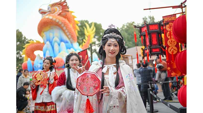 28日江蘇南京,身著古裝的年輕人在景楓中心新春市集上巡遊。隨著農曆春節即將到來,南京街頭開設新春市集、燈會等,喜慶的氛圍越來越濃。 中新社