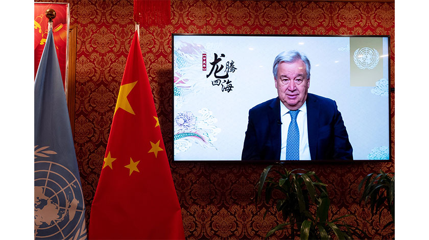 當地時間2月6日,聯合國秘書長古特雷斯通過視頻發表新春致辭,向中國人民和全球華人致以農曆甲辰龍年的祝福和問候。圖為中國常駐聯合國代表團紐約駐地的屏幕播放致辭。 中新社