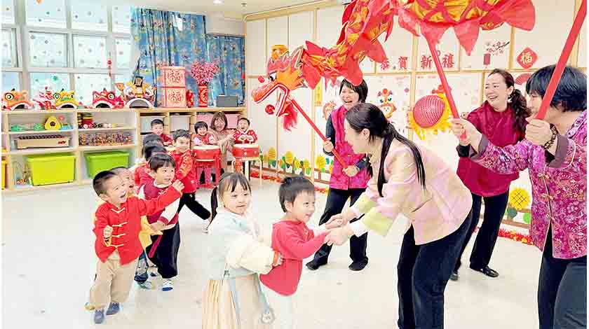 導師透過立體故事書向幼兒講解春節的來源和習俗故事,並介紹各種新春祝賀語句,幼兒們穿上色彩鮮艷奪目的中國傳統服飾,舞龍舞獅和敲打鑼鼓,場面熱鬧更趣致可愛,個個手持各色各樣的賀年飾物拍照保留倩影,互相祝賀聰明伶俐及快高長大,品嚐各式賀年食品,由食品中了解中國傳統文化;在導師的指導和協助下,幼兒色彩鮮麗的桃花樹及賀年揮春由此誕生,選用有機食材讓幼兒一起製作七彩湯圓及餃子,寓意團團圓圓,吉祥如意,樂叫幼兒寓遊玩中學習;此外,新口岸及澳大校區托兒所還分別舉行了「新春親子活動」,讓家長和幼兒透過遊戲互動及完成親子勞作「手工龍」和「龍年福袋」,共享親子歡聚時光,活動現場處處洋溢著其樂融融的節日氣氛,場面溫馨又熱鬧。