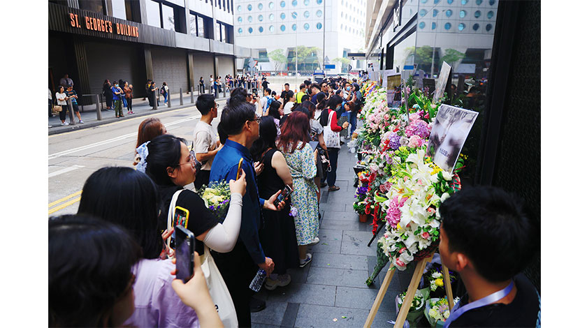 在文華東方酒店外,記者看到不少年輕義工幫忙維持秩序,將花圈擺放整齊。