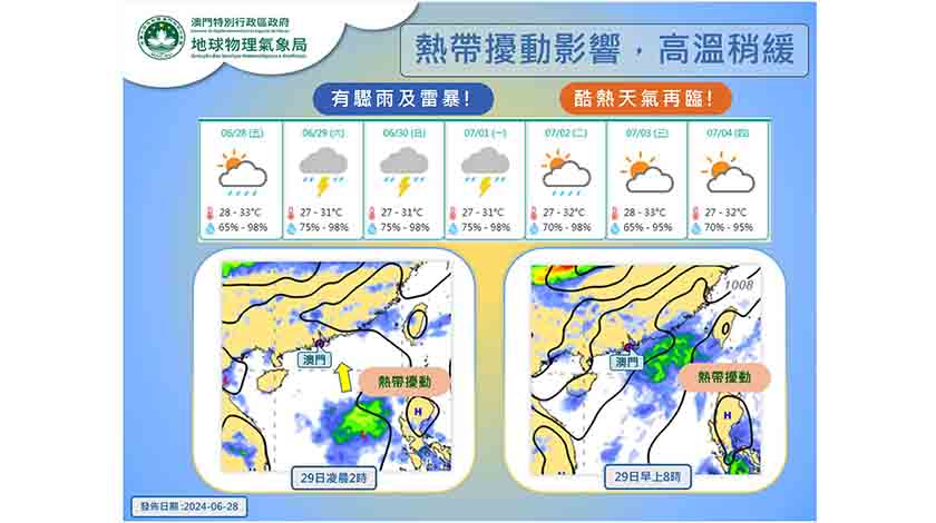 氣象局指,雖然該熱帶擾動進一步發展的機會較低,但隨著其靠近華南沿岸,相關雲雨區將於今日影響珠江口一帶。同時,由於西南季風有所增強,預料本澳今日至周一驟雨會增多及有雷暴,風勢較大,酷熱的程度亦將稍緩。
