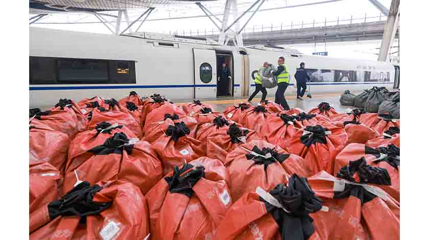 11月11日,北京南站,工人向G189次列車上接力搬運快件。自11月1日“雙十一”網購高峰期鐵路快運服務啟動以來,中鐵快運股份有限公司北京南站營業部日均發貨1200多件、22噸,是平時2倍多。中新社