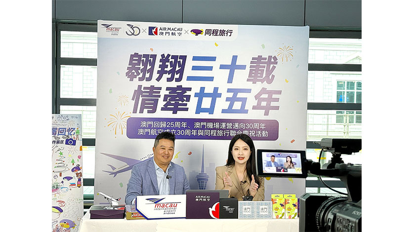 【特訊】澳門國際機場明年將迎來通航30周年,為慶祝這重要里程,澳門國際機場準備了一連串精彩活動與同業及旅客一同分享這份喜悅。2024年12月26日於澳門國際機場離境層位置與同程旅行網聯手帶來了主題為“翱翔三十載,情牽廿五年”的直播活動,為機場周年慶祝活動揭開序幕。於兩小時的直播活動中,澳門國際機場與澳門特別行政區政府旅遊局及澳門航空旨在透過一系列的線上渠道多角度推廣澳門旅遊、航線網絡及旅遊體驗。
