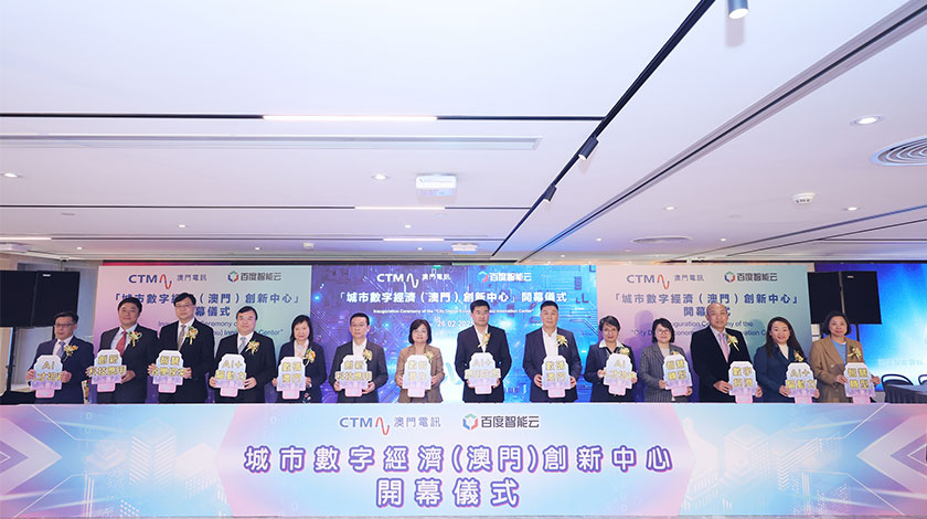 「城市數字經濟(澳門)創新中心」開幕儀式2月26日假澳門電訊高地烏街總店舉行,澳門中聯辦經濟部副部長楊全州、澳門郵電局局長劉惠明、澳門生產力暨科技轉移中心理事長關治平、澳門中華教育會副會長何少金、立法議員宋碧琪、梁鴻細、黃潔貞、馬耀鋒、胡祖杰、張健中、百度智能雲中國區副總經理吳軍華、用友軟件澳門有限公司董事總經理張勇及澳門電訊潘福禧行政總裁等出席儀式。