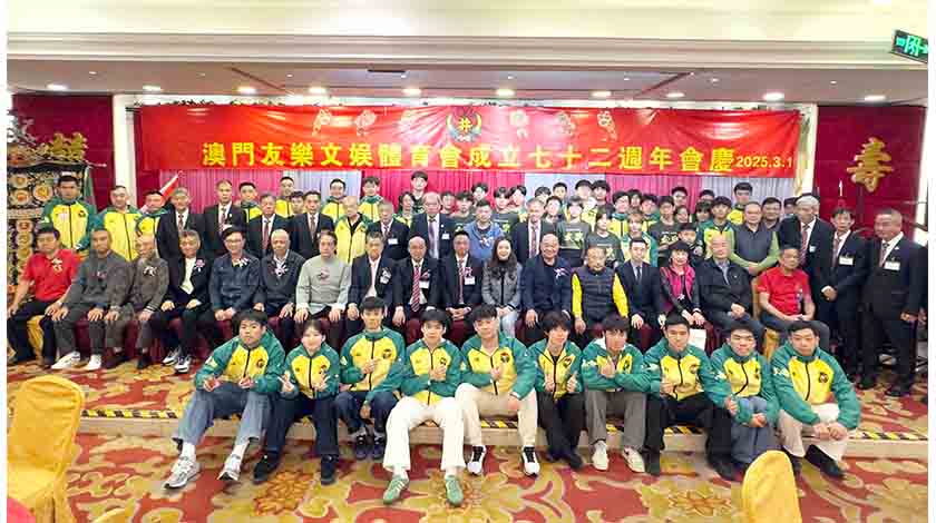 【特訊】澳門友樂文娛體育會日前(三月一日)晚在金匯海鮮火鍋酒家舉行慶祝成立七十二周年會慶聯歡晚宴,永遠會長文漢、會長趙成蔚、總監葉永源、理事長楊有成勉勵全體成員再接再厲,秉承創會初心,弘揚及傳承中華武術文化,為澳門社會繁榮穩定、慈善公益及體育事業發展貢獻綿力。