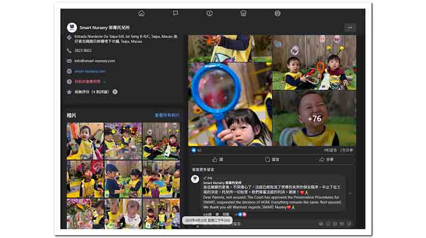 【本報訊】社工局上月宣布終止崇專托兒所資助並收回場地設施。崇專托兒所昨在自己的社交媒體帖文留言表示,法庭已經批准崇專托兒所的保全程序,中止了社工局的決定,托兒所一切如常。