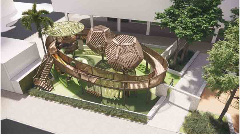 台山中街休憩區使用率高,設施已使用多年並已出現破損等情況,故市政署以“都市綠洲”作為設計主題,融合自然元素,保留休憩區現有樹木,結合綠化景觀,營造城市綠洲的休閒體驗。在樹木圍繞下,增加以樹屋造型的定制化兒童遊具,配置高架探索走道,充分利用有限的場地空間,向學童少年提供遊樂及探索自然的樂趣。同時,重新規劃佈局,設康體及閒坐區,優化通行動線等,提升休憩區的環境品質。