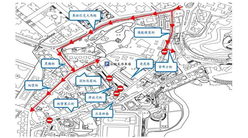 在實施臨時交通管制期間,駕駛者如欲從奧林匹克大馬路前往地堡街或消防局前地一帶路段,可從奧林匹克大馬路轉入黑橋街,從而轉入地堡街或消防局前地一帶路段。(見附圖)