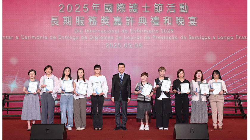 衛生局於日前舉行“慶祝2025年國際護士節活動 - 長期服務獎嘉許典禮”,中央人民政府駐澳門特別行政區聯絡辦公室宣傳文化部殷汝濤副部長,澳門特別行政區政府衛生局羅奕龍局長、郭昌宇、鄭成業、陳永華副局長出席活動並擔任頒奬嘉賓,嘉許了於本澳長期服務滿20年和30年合共72名護士,以示特區政府肯定和讚揚其對護理工作的專業貢獻。