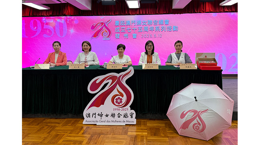 婦聯總會昨假該會禮堂舉行「澳門婦女聯合總會成立七十五周年系列活動」發布會,出席發布會代表包括﹕澳門婦女聯合總會會長劉金玲、理事長袁小菱、副理事長兼秘書長庄玲玲、副理事長吳嘉婷、何嘉欣。