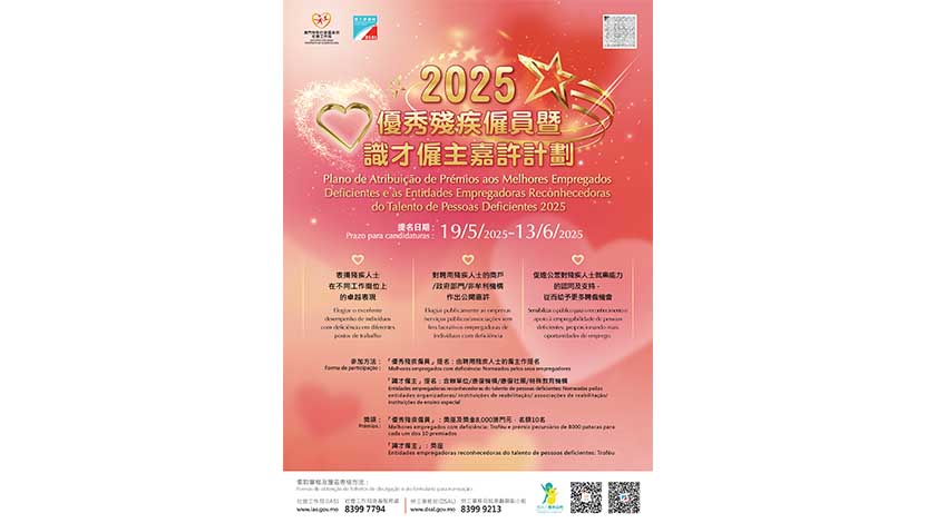 【特訊】為表揚本澳在不同工作崗位上有傑出表現的殘疾人士,並公開嘉許聘用殘疾人士的商戶、政府部門或非牟利機構,以促進公眾對殘疾人士就業能力的了解及接納,給予殘疾人士更多就業機會,協助他們融入社會,勞工事務局與社會工作局合辦“2025優秀殘疾僱員暨識才僱主嘉許計劃”,將於5月19日至6月13日接受提名。