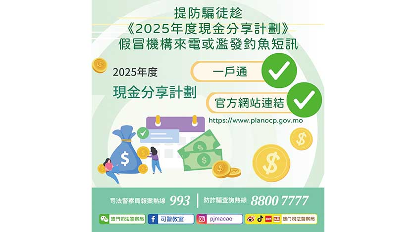 【特訊】《2025年度現金分享計劃》現已開始,居民可於2025年5月29日下午三時起登入“一戶通”或現金分享計劃網頁(https://www.planocp.gov.mo/)查詢是否符合發放資格。符合發放資格的人士會按照既定的時間表,透過銀行轉帳或支票方式自動收取款項,無需提出申請。